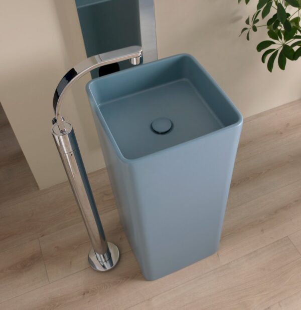 Monowash è un lavabo a colonna realizzato in un unico blocco di ceramica. La forma della vasca, quadrata con angoli smussati, e della colonna, leggermente ristretta verso il basso, ne fanno un elemento dalla geometria precisa ma dalle forme morbide. Un elemento particolare è lo spessore del materiale, ridotto al minimo per raggiungere il massimo delle possibilità espressive della ceramica. Un’altra sfida di Flaminia all’uso sempre più tecnico della materia. “AZ” è un intervento di decoro diesgnato da A.Mendini, di grande impatto visivo che dà una inedita immagine al lavabo Monowash.