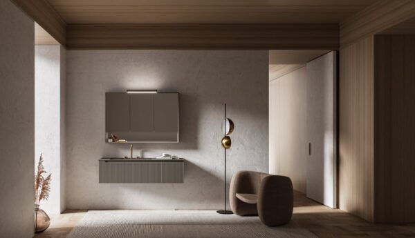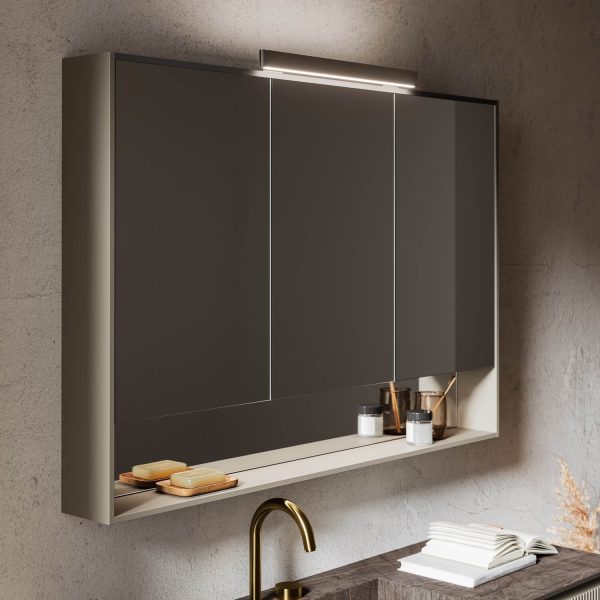 Lo specchio CUBE è disponibile in diverse dimensioni a 2-3-4 ante, con il pratico vano a giorno inferiore che può essere illuminato da una striscia led dedicata.