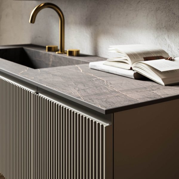 In questo dettaglio, si evidenzia la nuova finitura Navajo Gold del top in HPL, una scelta mirata per un piano pratico e durevole, ma allo stesso tempo esclusivo.