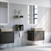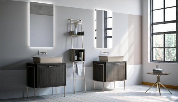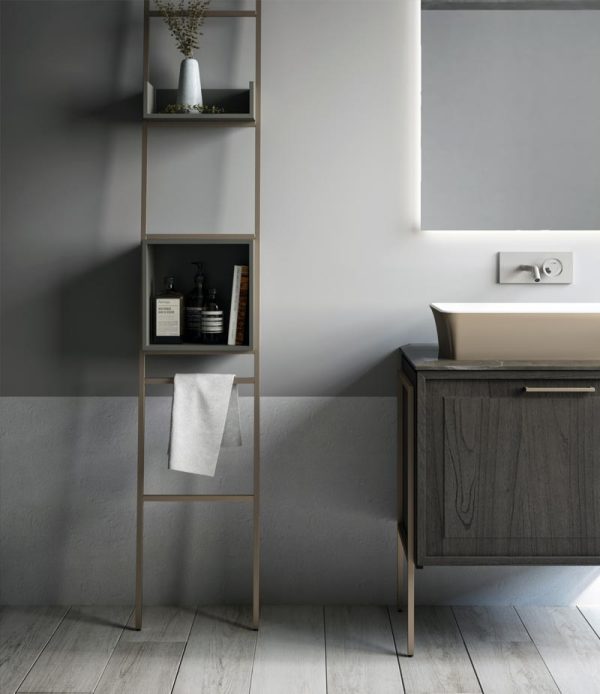 Occupa l’intera parete questa composizione pensata per il bagno padronale, caratterizzata da ampi spazi e finiture preziose.La finitura nickel di Structura si ritrova anche nel lavabo e nella scaletta.
