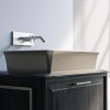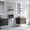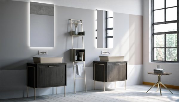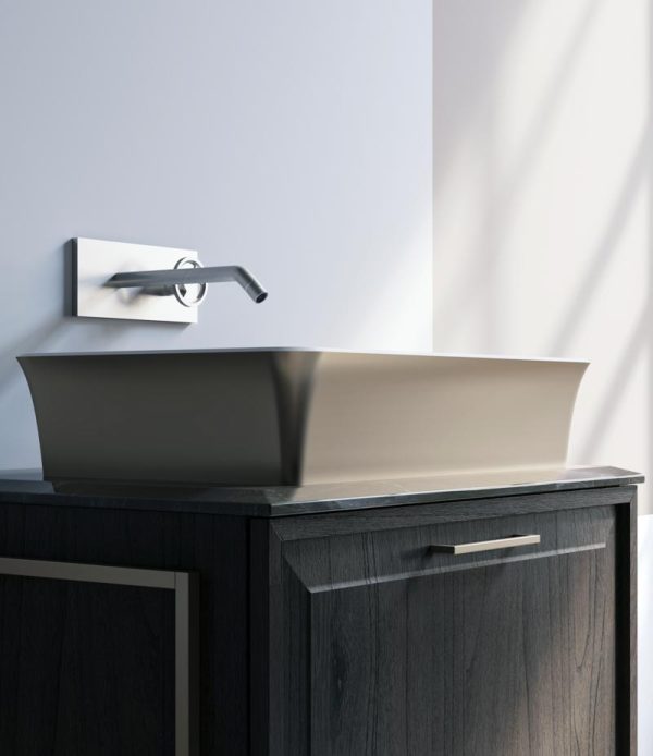Un capiente lavabo soprapiano con finitura esterna in nickel appoggia sul prezioso top in pietra grey.