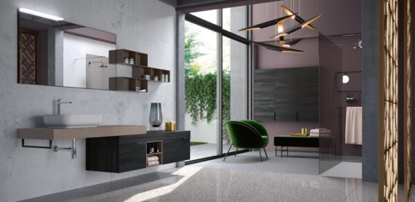 L’idea? Saper guardare oltre il bagno per creare un arredo unico e personale che dialoga con lo spazio circostante. Sperimentare nuovi accostamenti di forme e materiali. Un dinamico movimento grafico l’alternanza tra piani, volumi, spessori e materiali diversi definisce la composizione; una soluzione flessibile e altamente personalizzabile.