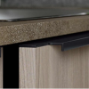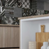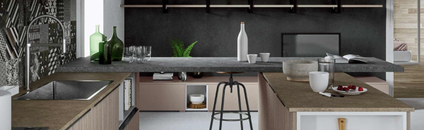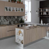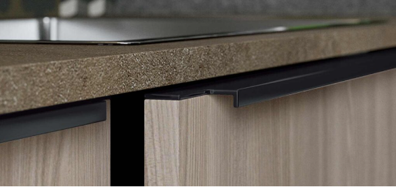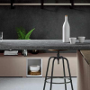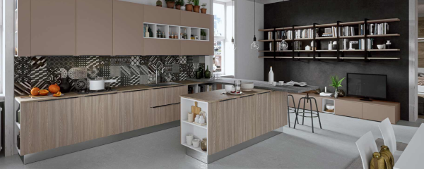 Geometrie essenziali e colori sobri definiscono lo stile della cucina, impreziosita da interessanti dettagli di design, come i moduli a giorno che circondano i raffinati pensili con ante in vetro.