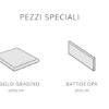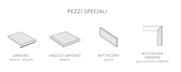 Sono disponibili anche diversi pezzi speciali: il gradino (25X35 cm, 30X35 cm), l’angolo gradino (35X35 cm), il battiscopa (9X30 cm) e il battiscopa gradino destro e sinistro (9X30 cm).